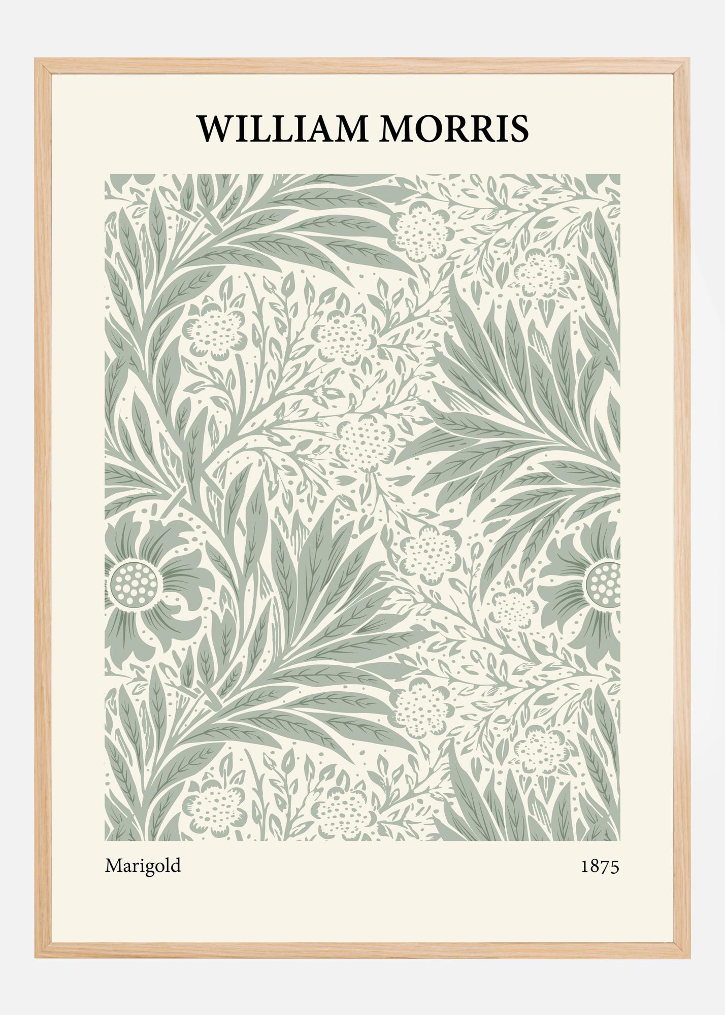 Denne distinkte plakaten viser William Morris' design "Marigold" fra år 1875, som viser en rikdom av naturinspirerte motiver, alle fremstilt med en umiskjennelig dyktighet og øye for detaljer. Den livlige, men likevel subtile grønne fargepaletten er typisk for Morris' design, og gir liv til hvert blad og kronblad, noe som gjør kunstverket til en tidløs interiørklassiker.