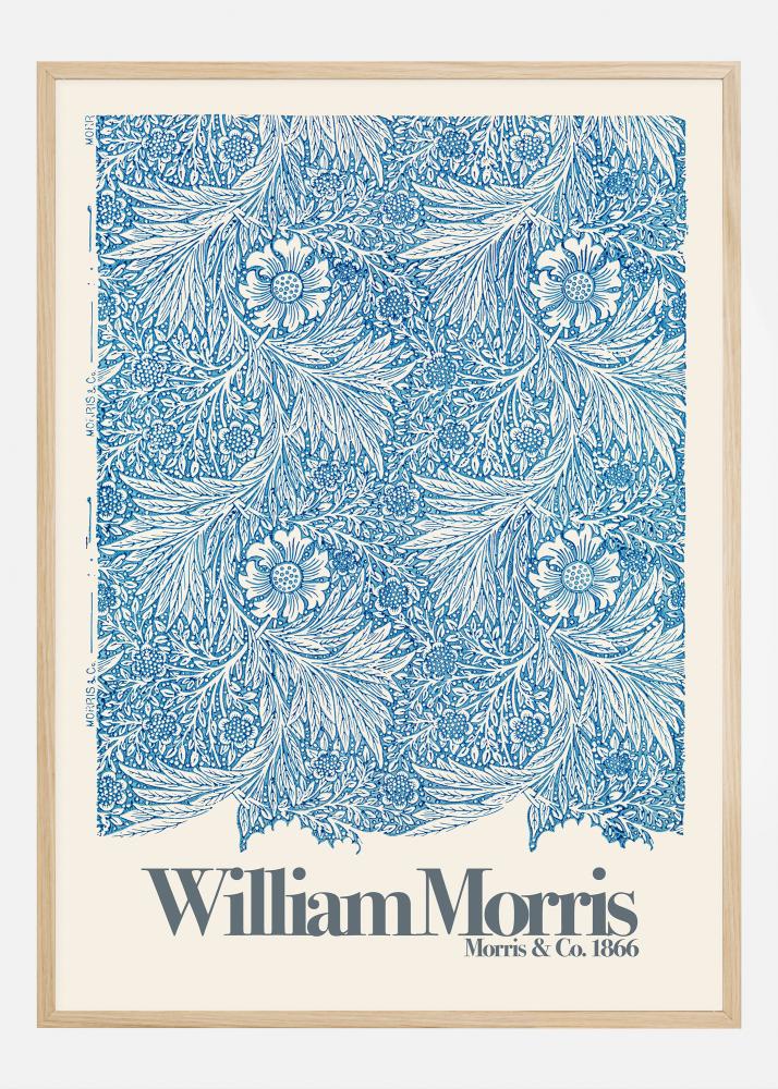Denne plakaten viser et klassisk William Morris-mønster med navnet "Marigold", skapt av Morris & Co. rundt 1866. Det ikoniske mønsteret, kjent for sine intrikate og naturinspirerte elementer, er fremstilt i en dypblå farge mot en ren, kremfarget bakgrunn. Hver detalj i blomsterarrangementet er nøye utmeislet, noe som viser Morris' sans for skjønnhet i det naturlige og en evne til å omdanne det til kunstverk som er tidløse og elsket ennå i dag.