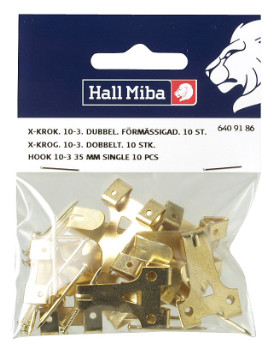 Varenummer:Messingfarget dobbel X-krok til montering på tre- eller gipsvegg. Kan belastes opptil 10 kg.