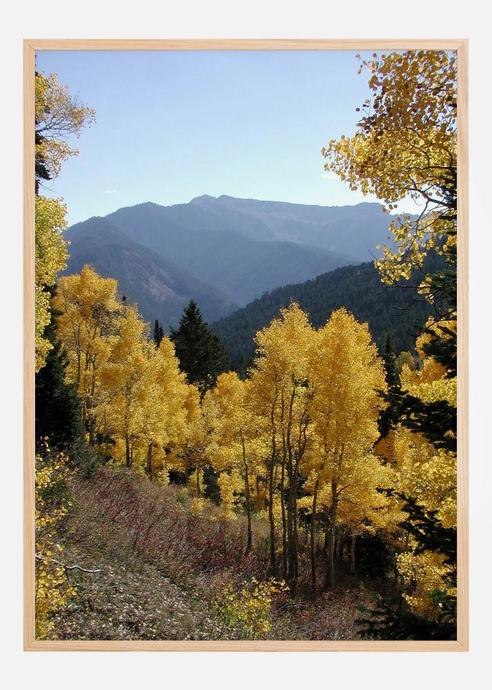 En lys landskapsplakat med gule trær med en blå fjellkjede bak. De gule trærne skaper en virkelig indisk sommer-følelse der de lyser opp denne skogscenen. Føl den varme brisen over fjellet i dette tidlige høstbildet.
