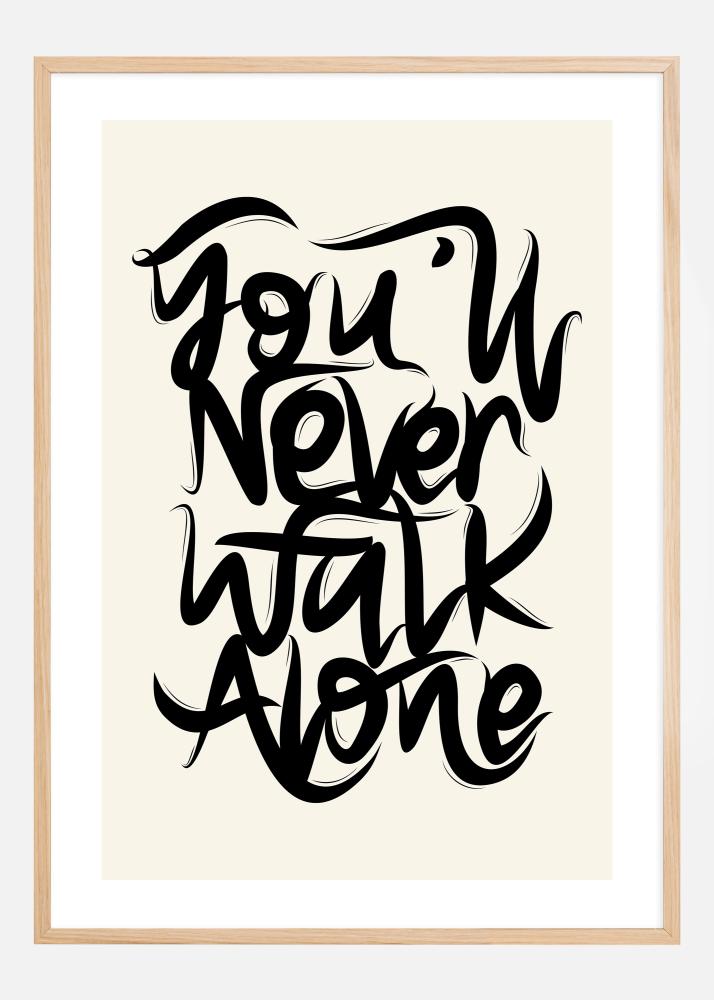 Denne kraftige plakaten presenterer en leken og kunstnerisk kalligrafi av frasen "You Never Walk Alone" i svertet tekst mot en varm, kremfarget bakgrunn. Den flytende og dynamiske stilen av typografi viser ordene som er flettet sammen, hvilket gir et uttrykk av bevegelse og samhold. Designen balanserer dyktig mellom lesbarhet og kunstnerisk frihet, hvilket gjør teksten både en budskapsbærer og et estetisk objekt i seg selv.
