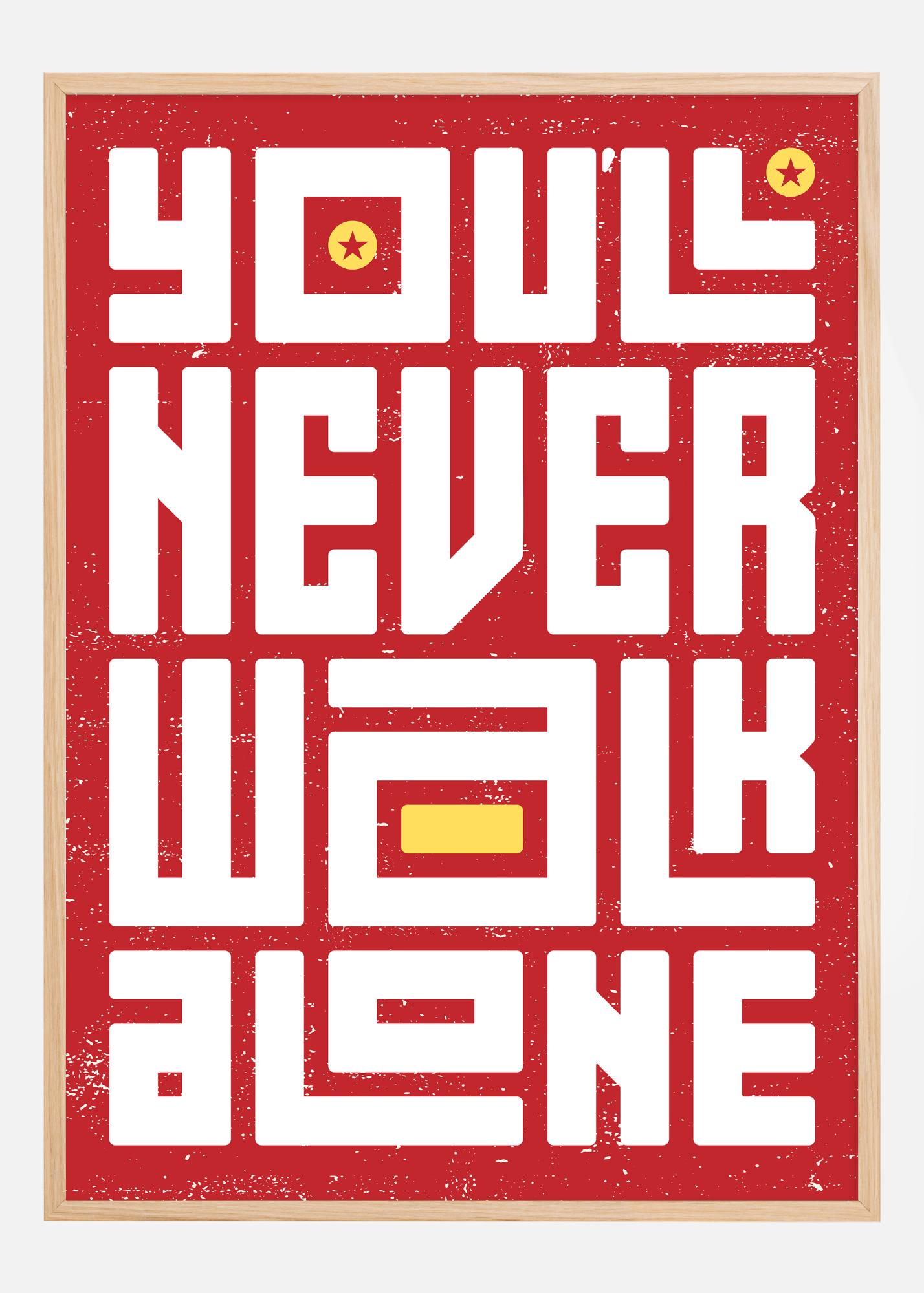 Denne energiske og oppløftende posteren utstråler en sterk tilstedeværelse med sin dristige, blokklignende typografi som fremhever budskapet "You'll Never Walk Alone" i lysende hvite bokstaver mot en kraftfull rød bakgrunn. De store bokstavene er omsorgsfullt arrangert for å maksimere deres visuelle effekt og er utsmykket med gullfargede stjerner og en rektangulær form som bryter av tekstblokken, hvilket tilfører en ytterligere dimensjon til designen.