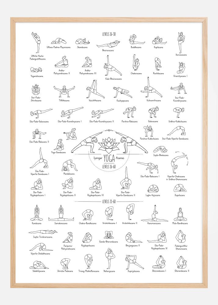 Sentralisert og i fokus på plakaten er tittelen 'Iyengar YOGA Asanas' og vanskelighetsgradene, som indikerer at disse øvelsene stammer fra den spesifikke yogaformen utviklet av B.K.S. Iyengar. Denne pedagogiske plakaten er perfekt for en yogaentusiast som ønsker å fordype sin praksis samt for instruktører som trenger en visuell referanse i sine studioer. Dens rene og enkle design gjør den til en elegant og funksjonell dekorasjon, samtidig som den bidrar med en inspirerende og lærerik atmosfære i rommet.