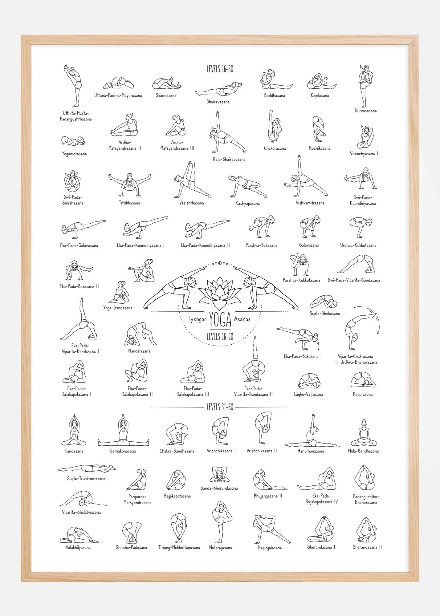 Denne omfattende og detaljerte plakaten framstiller et mangfold av yogaasanas, tilpasset for mellomliggende og avanserte utøvere. Hver posisjon er nøye tegnet med enkel linjekunst, noe som gjør det lett for betrakteren å forstå hver poses form og retning. Asanaene er organisert i kolonner etter vanskelighetsgrad, fra nivå 16 til 30, og hver pose er tydelig merket med sitt tradisjonelle sanskritnavn.