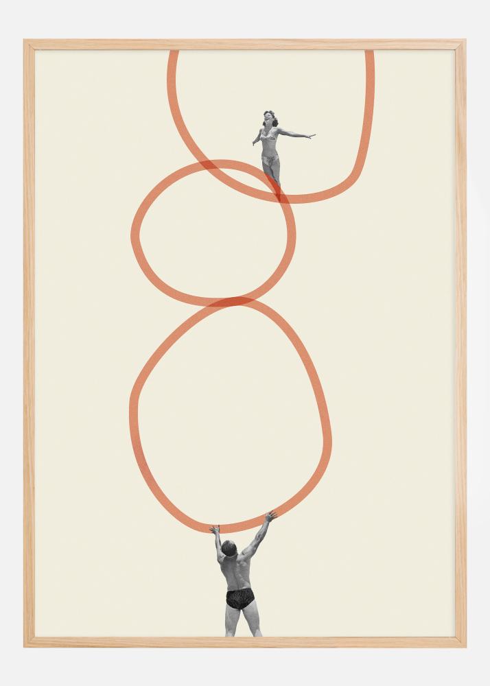 Denne unike plakaten presenterer en komposisjon som ligner en dans av konturer og menneskelig interaksjon. Bildet viser en person i en sveipende bevegelse, balansert av en annen figur som står sterk og stødig på bakken, begge innrammet av flytende terrakotta-røde sirkler som skaper en følelse av bevegelse og kontinuitet.